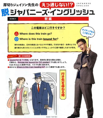 厚切りジェイソン 脱ジャパニーズイングリッシュ(駅編) VISA 2020 11月号より 1.この電車はどこ行きですか? 2.成田空港へは新宿で降りて成田エクスプレスに乗り換えてください。 英語で言えますか ↓ ↓ ↓ 1の答え 2の答え