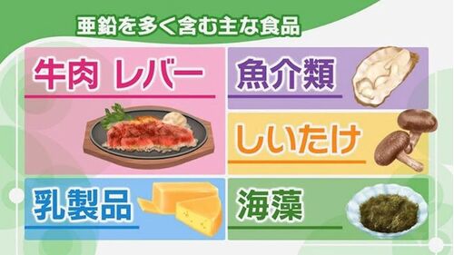 NHK健康チャンネルより 味覚障害の治療・予防に必要な「亜鉛」を多く含む食品 https://www.nhk.or.jp/kenko/atc_552.html 亜鉛を多く含む食品を積極的にとりましょう。 「牛肉やレバー」 「チーズなどの乳製品」 「牡蠣やカニ、いわしなどの魚介類」 「しい…