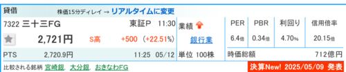 持ち株の三十三FGがストップ高になりました! https://kabutan.jp/stock/news?code=7322&b=k202505090378 三十三FG、今期経常は34%増で4期連続最高益、前期配当を6円増額・今期は28円増配へ https://kabutan.jp/stock/news?code=7322&b=k202505090378 3…